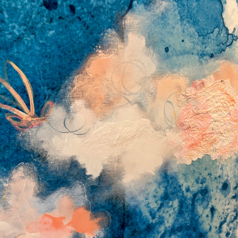 Palmisano was commissioned to create a mural on the “Winter” floor of the new Credit Karma Headquarters in South Charlotte. She designed and embellished fabric in her studio and then installed it onsite. Then she layered paper, thread, ink, and paint over top to create a uniquely textured fiber mural. By incorporating her signature cloud imagery, Palmisano hoped to inspire employees to dream big everyday.