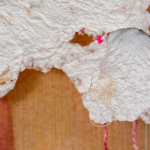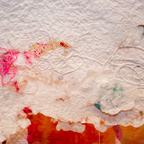 Incantation is a multi-layered, up-cycled, textile dreamscape that was exhibited at Mint Museum Uptown. Palmisano created original artwork, which was photographed and printed onto fabric for layering and intuitive stitching. Delicate clouds of handmade paper hang throughout the dreamscape. Each cloud held the memories of children’s big ideas, as the paper was created using scraps of discarded artwork from the Fort Mill Cooperative Preschool’s art studio.